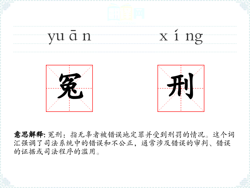 冤刑:指无辜者被错误地定罪并受到刑罚的情况。这个词汇强调了司法系统中的错误和不公正,通常涉及错误的审判、错误的证据或司法程序的滥用。