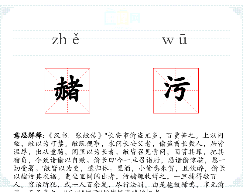 1.《汉书.张敞传》"长安市偷盗尤多,百贾苦之。上以问敞,敞以为可禁。敞既视事,求问长安父老,偷盗酋长数人,居皆温厚,出从童骑,闾里以为长者。敞皆召见责问,因贳其罪,把其宿负,令致诸偷以自赎。偷长曰'今一旦召诣府,恐诸偷惊骇,愿一切受署。'敞皆以为吏,遣归休。置酒,小偷悉来贺,且饮醉,偷长以赭污其衣裾。吏坐里闾阅出者,污赭辄收缚之,一旦捕得数百人。穷治所犯,或一人百余发,尽行法罚。由是枹鼓稀鸣,市无偷盗,天子嘉之。"后以"赭污"指捕捉盗贼的权术。