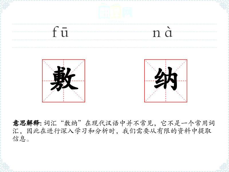 词汇“敷纳”在现代汉语中并不常见,它不是一个常用词汇,因此在进行深入学习和分析时,我们需要从有限的资料中提取信息。
