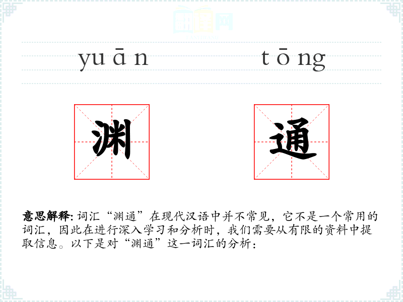 “渊”字在古代汉语中指深水,引申为深邃、深远之意;“通”字则有通达、贯通之意。两者结合,形成了“渊通”这一词汇,用来形容深邃且通达的状态。