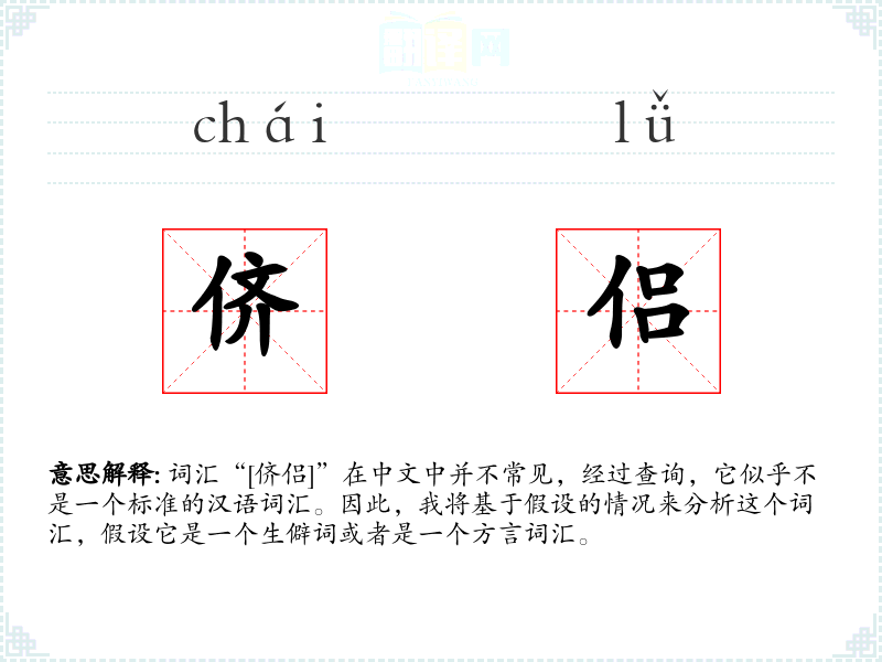 词汇“[侪侣]”在中文中并不常见,经过查询,它似乎不是一个标准的汉语词汇。因此,我将基于假设的情况来分析这个词汇,假设它是一个生僻词或者是一个方言词汇。