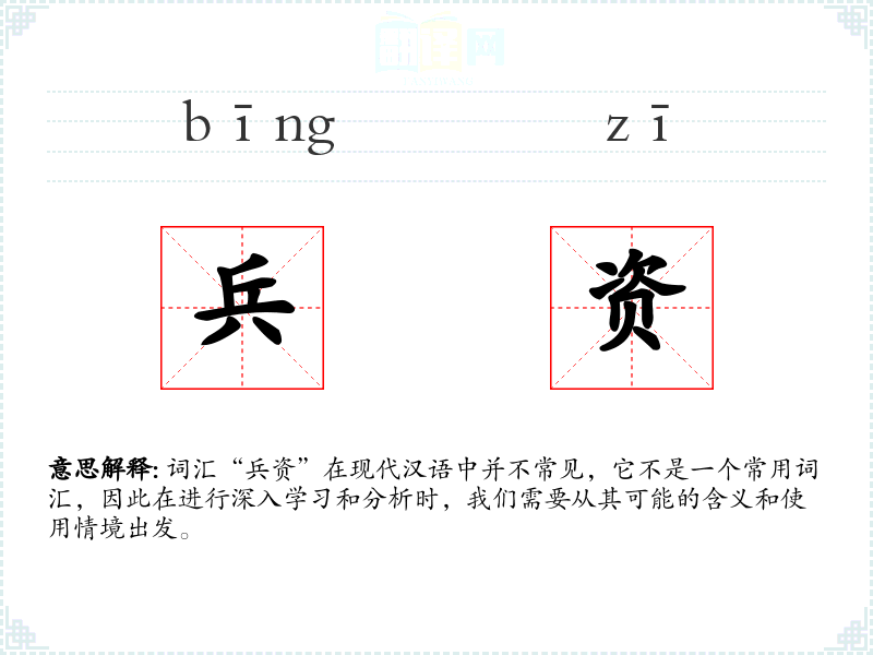 - 反义词:(由于“兵资”不是一个常用词汇,反义词不明显,但可以考虑“民用物资”等)