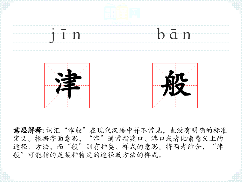 由于“津般”不是一个常用词汇,其词源和历史演变不详。在现代汉语中,这个词的使用频率极低,可能只在某些特定文献或文学作品中出现。