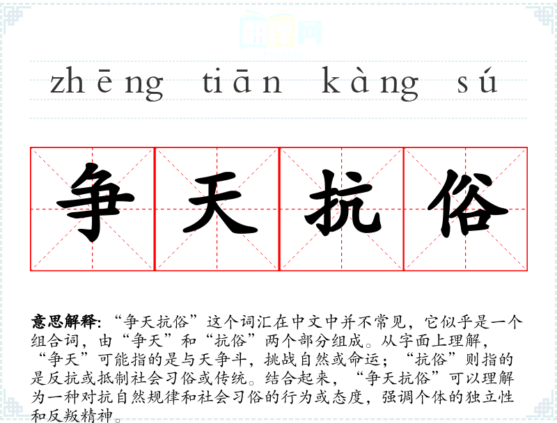 由于“争天抗俗”不是一个常用词汇,其词源和演变不太明确。它可能是现代汉语中新组合的词汇,用以表达特定的思想或情感。