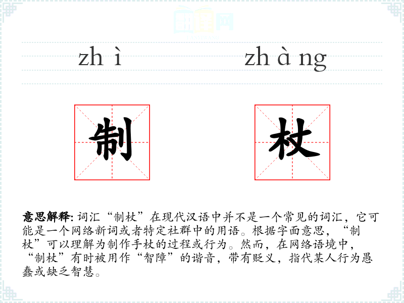 词汇“制杖”在现代汉语中并不是一个常见的词汇,它可能是一个网络新词或者特定社群中的用语。根据字面意思,“制杖”可以理解为制作手杖的过程或行为。然而,在网络语境中,“制杖”有时被用作“智障”的谐音,带有贬义,指代某人行为愚蠢或缺乏智慧。