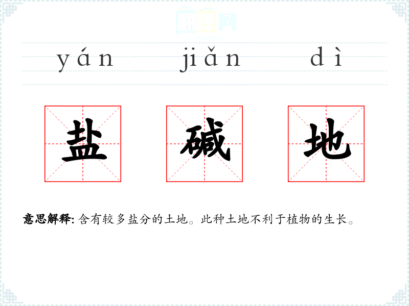 含有较多盐分的土地。此种土地不利于植物的生长。