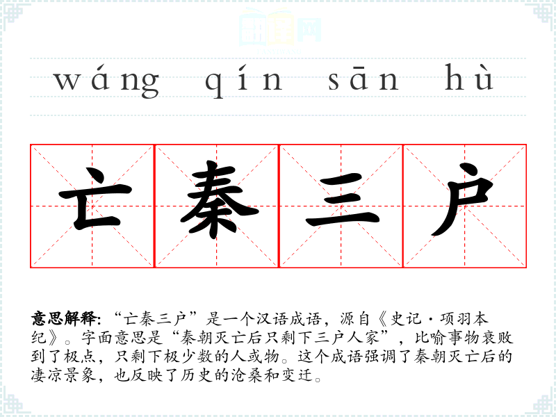 “亡秦三户”源自《史记·项羽本纪》,记载了秦朝灭亡后的凄凉景象。随着时间的推移,这个成语被广泛用于描述各种衰败的场景,成为汉语中表达极度衰败的常用词汇。