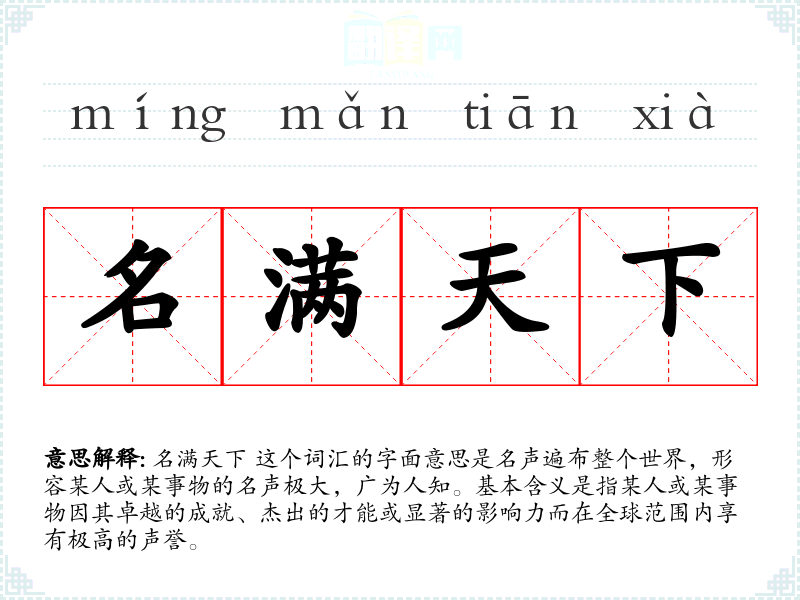 名满天下 这个词汇的字面意思是名声遍布整个世界,形容某人或某事物的名声极大,广为人知。基本含义是指某人或某事物因其卓越的成就、杰出的才能或显著的影响力而在全球范围内享有极高的声誉。