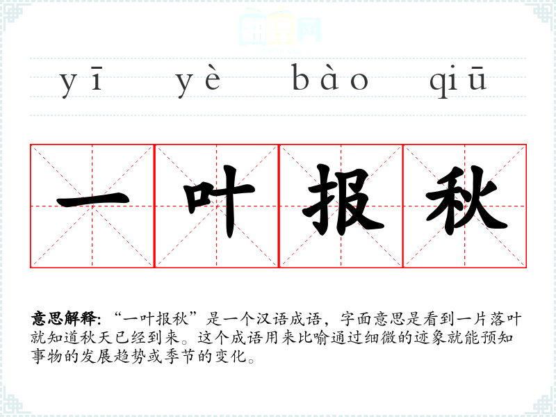 “一叶报秋”是一个汉语成语,字面意思是看到一片落叶就知道秋天已经到来。这个成语用来比喻通过细微的迹象就能预知事物的发展趋势或季节的变化。