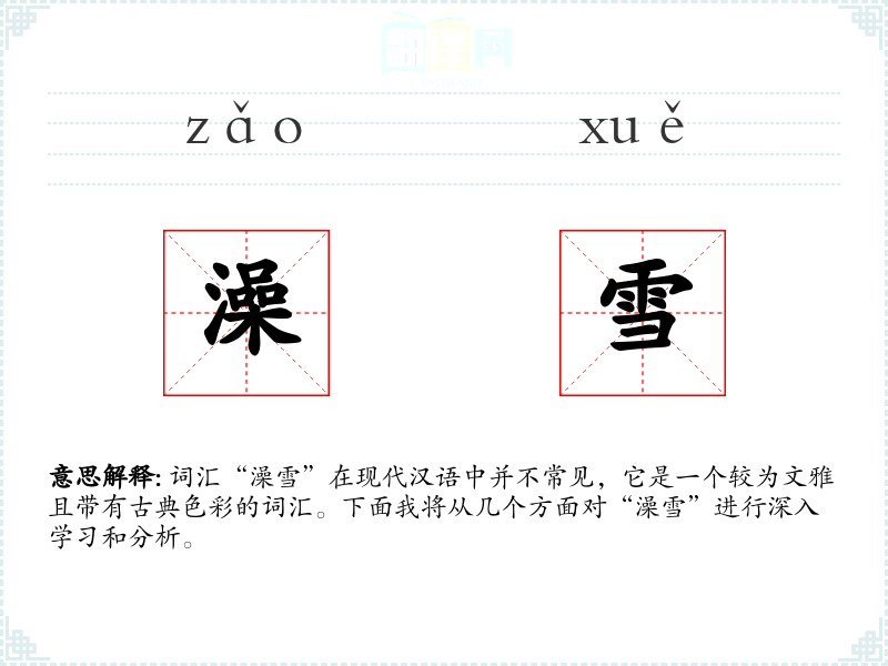 词汇“澡雪”在现代汉语中并不常见,它是一个较为文雅且带有古典色彩的词汇。下面我将从几个方面对“澡雪”进行深入学*和分析。