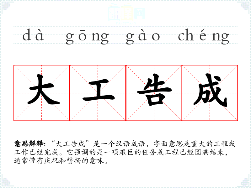 “大工告成”是一个汉语成语,字面意思是重大的工程或工作已经完成。它强调的是一项艰巨的任务或工程已经圆满结束,通常带有庆祝和赞扬的意味。