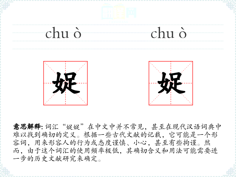 由于“娖娖”不是一个常用词汇,其字面意思和基本含义并不明确。根据有限的资料,它可能与谨慎、小心或拘谨的行为有关。
