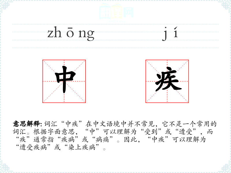 - “中”字在古代汉语中有“受到”、“遭遇”的意思,而“疾”一直指疾病。这两个字组合在一起,形成了“中疾”这个词汇,其含义相对固定,没有明显的历史演变。