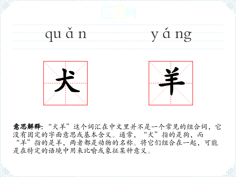 “犬羊”这个词汇在中文里并不是一个常见的组合词,它没有固定的字面意思或基本含义。通常,“犬”指的是狗,而“羊”指的是羊,两者都是动物的名称。将它们组合在一起,可能是在特定的语境中用来比喻或象征某种意义。