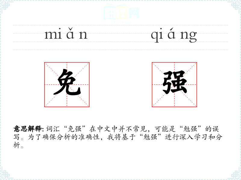 词汇“免强”在中文中并不常见,可能是“勉强”的误写。为了确保分析的准确性,我将基于“勉强”进行深入学*和分析。