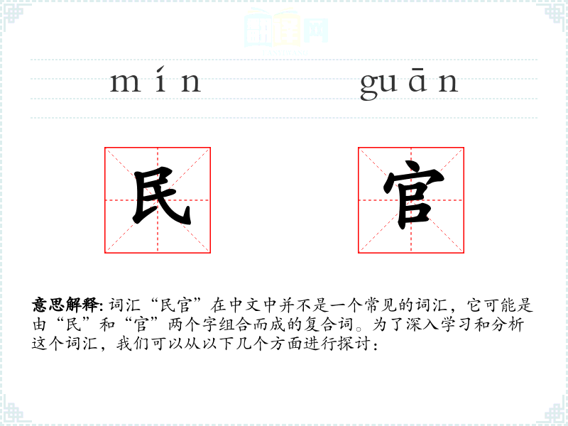 词汇“民官”在中文中并不是一个常见的词汇,它可能是由“民”和“官”两个字组合而成的复合词。为了深入学*和分析这个词汇,我们可以从以下几个方面进行探讨: