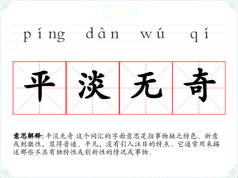 平淡无奇 这个词汇的字面意思是指事物缺乏特色、新意或刺激性,显得普通、平凡,没有引人注目的特点。它通常用来描述那些不具有独特性或创新性的情况或事物。