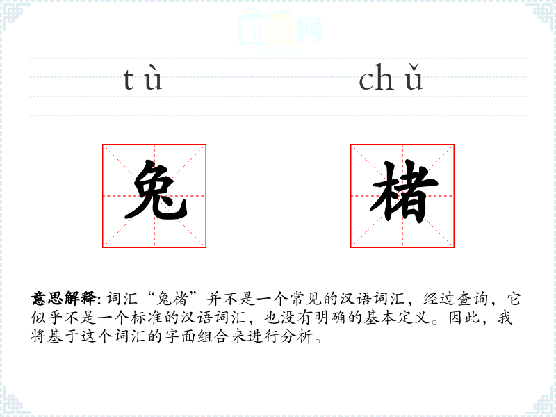 词汇“兔楮”并不是一个常见的汉语词汇,经过查询,它似乎不是一个标准的汉语词汇,也没有明确的基本定义。因此,我将基于这个词汇的字面组合来进行分析。