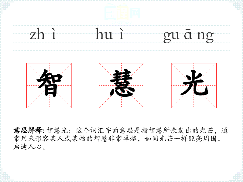 智慧光:这个词汇字面意思是指智慧所散发出的光芒,通常用来形容某人或某物的智慧非常卓越,如同光芒一样照亮周围,启迪人心。