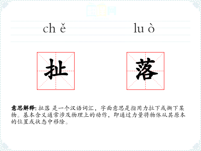 扯落 是一个汉语词汇,字面意思是指用力拉下或撕下某物。基本含义通常涉及物理上的动作,即通过力量将物体从其原本的位置或状态中移除。