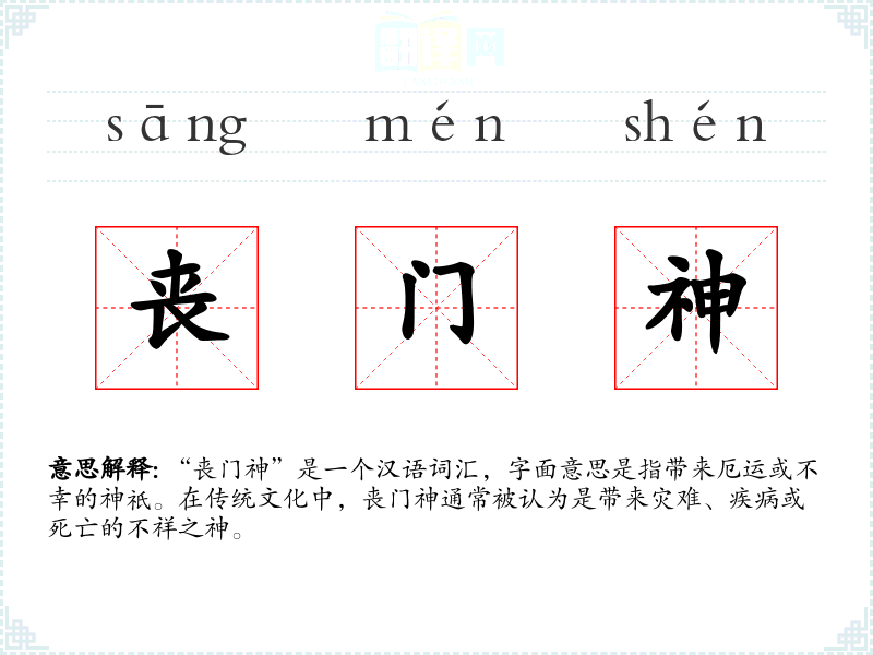 “丧门神”是一个汉语词汇,字面意思是指带来厄运或不幸的神祇。在传统文化中,丧门神通常被认为是带来灾难、疾病或死亡的不祥之神。