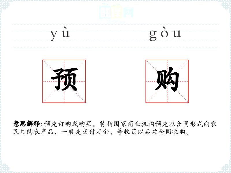 预先订购或购买。特指国家商业机构预先以合同形式向农民订购农产品,一般先交付定金,等收获以后按合同收购。