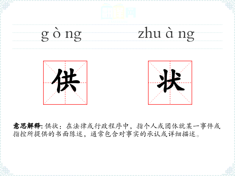 供状:在法律或行政程序中,指个人或团体就某一**或指控所提供的书面陈述,通常包含对事实的承认或详细描述。