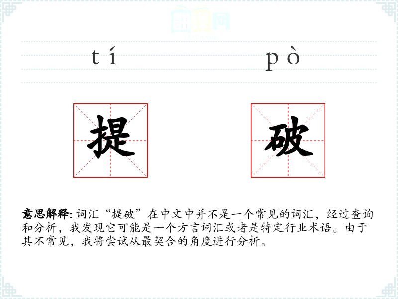 词汇“提破”在中文中并不是一个常见的词汇,经过查询和分析,我发现它可能是一个方言词汇或者是特定行业术语。由于其不常见,我将尝试从最契合的角度进行分析。