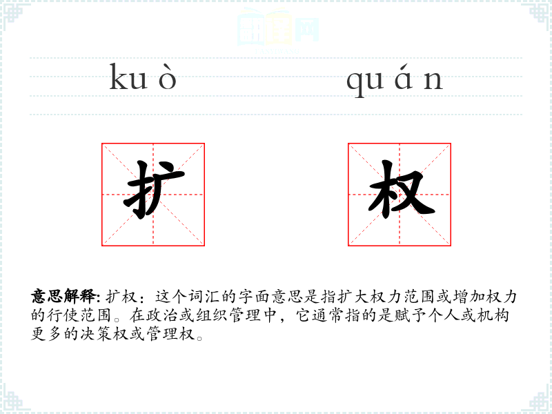 扩权:这个词汇的字面意思是指扩大权力范围或增加权力的行使范围。在政治或组织管理中,它通常指的是赋予个人或机构更多的决策权或管理权。