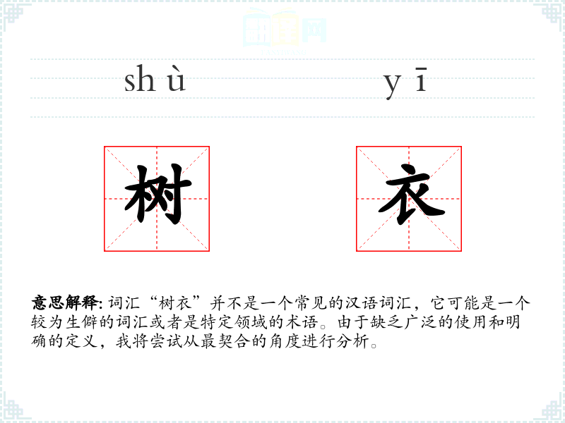 词汇“树衣”并不是一个常见的汉语词汇,它可能是一个较为生僻的词汇或者是特定领域的术语。由于缺乏广泛的使用和明确的定义,我将尝试从最契合的角度进行分析。
