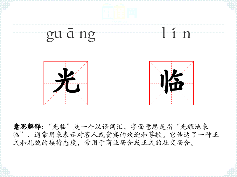 “光临”是一个汉语词汇,字面意思是指“光耀地来临”,通常用来表示对客人或贵宾的欢迎和尊敬。它传达了一种正式和礼貌的接待态度,常用于商业场合或正式的社交场合。