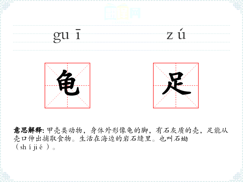 甲壳类动物,身体外形像龟的脚,有石灰质的壳,足能从壳口伸出捕取食物。生活在海边的岩石缝里。也叫石蜐(shíjié)。