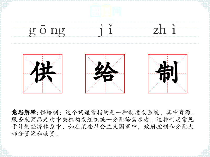 供给制:这个词通常指的是一种制度或系统,其中资源、服务或商品是由中央机构或组织统一分配给需求者。这种制度常见于计划经济体系中,如在某些社会主义国家中,政府控制和分配大部分资源和物资。