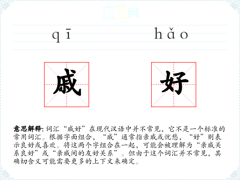 词汇“戚好”在现代汉语中并不常见,它不是一个标准的常用词汇。根据字面组合,“戚”通常指亲戚或忧愁,“好”则表示良好或喜欢。将这两个字组合在一起,可能会被理解为“亲戚关系良好”或“亲戚间的友好关系”。但由于这个词汇并不常见,其确切含义可能需要更多的上下文来确定。