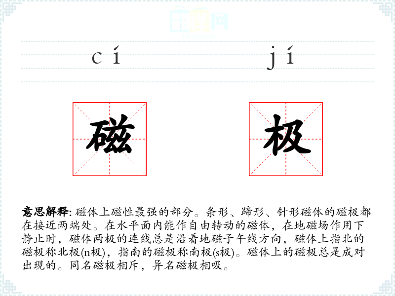 1.磁体上磁性最强的部分。条形、蹄形、针形磁体的磁极都在接近两端处。在水平面内能作自由转动的磁体,在地磁场作用下静止时,磁体两极的连线总是沿着地磁子午线方向,磁体上指北的磁极称北极(n极),指南的磁极称南极(s极)。磁体上的磁极总是成对出现的。同名磁极相斥,异名磁极相吸。