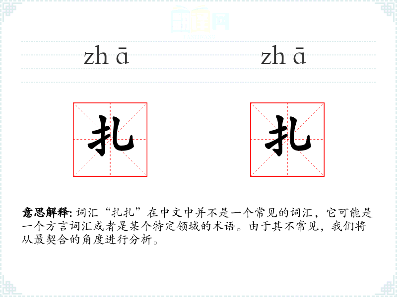 由于“扎扎”不是一个标准的中文词汇,我们无法给出一个确切的基本定义。它可能是一个拟声词,模仿某种声音,或者是某个地方的方言词汇。