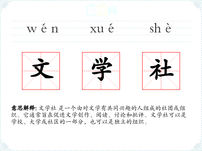 文学社 是一个由对文学有共同兴趣的人组成的社团或组织。它通常旨在促进文学创作、阅读、讨论和批评。文学社可以是学校、大学或社区的一部分,也可以是独立的组织。