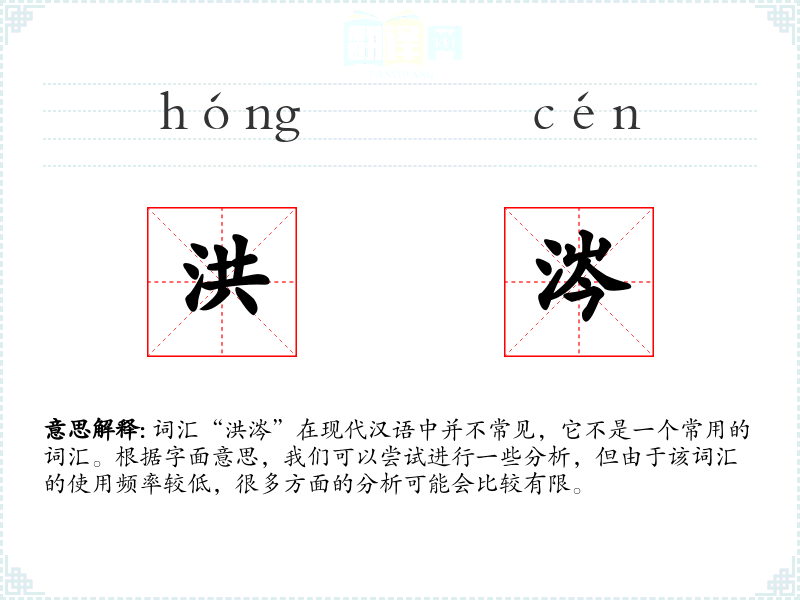 词汇“洪涔”在现代汉语中并不常见,它不是一个常用的词汇。根据字面意思,我们可以尝试进行一些分析,但由于该词汇的使用频率较低,很多方面的分析可能会比较有限。