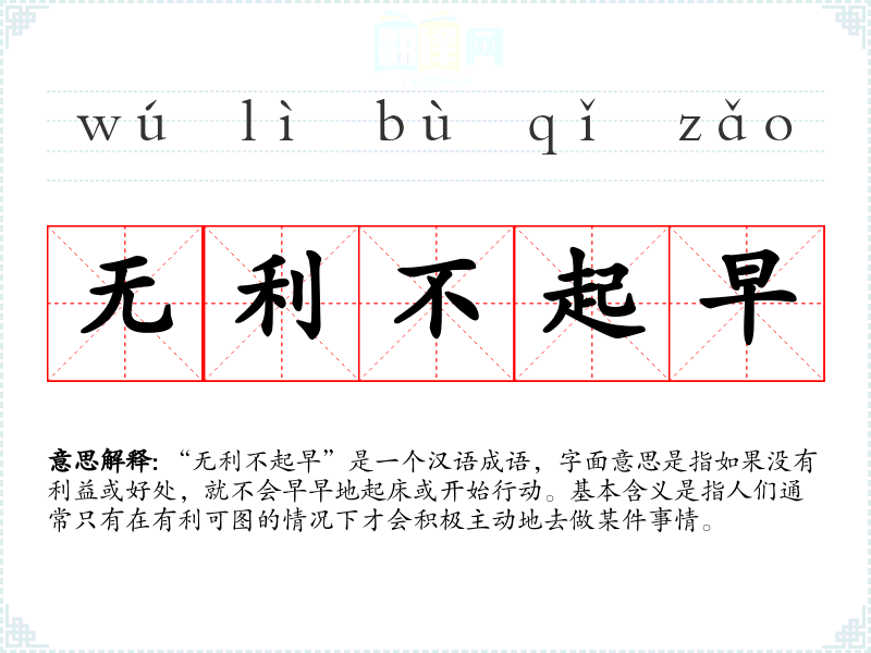 “无利不起早”是一个汉语成语,字面意思是指如果没有利益或好处,就不会早早地起床或开始行动。基本含义是指人们通常只有在有利可图的情况下才会积极主动地去做某件事情。