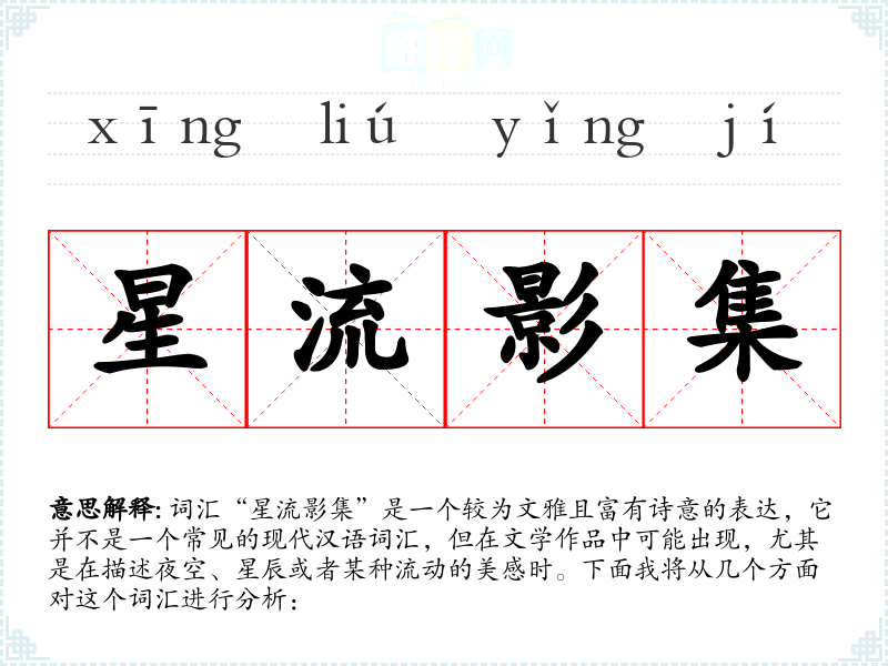 词汇“星流影集”是一个较为文雅且富有诗意的表达,它并不是一个常见的现代汉语词汇,但在文学作品中可能出现,尤其是在描述夜空、星辰或者某种流动的美感时。下面我将从几个方面对这个词汇进行分析:
