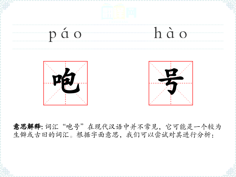 词汇“咆号”在现代汉语中并不常见,它可能是一个较为生僻或古旧的词汇。根据字面意思,我们可以尝试对其进行分析: