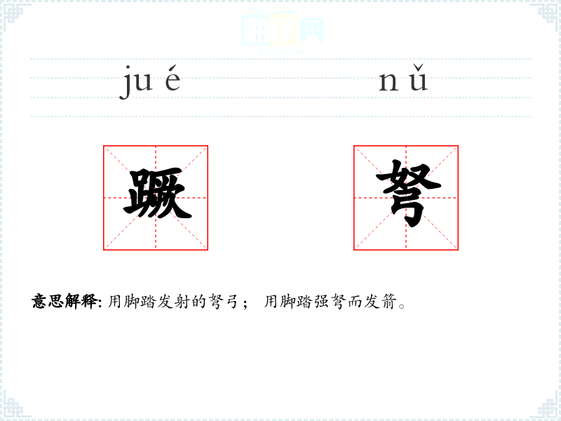 用脚踏发射的弩弓; 用脚踏强弩而发箭。