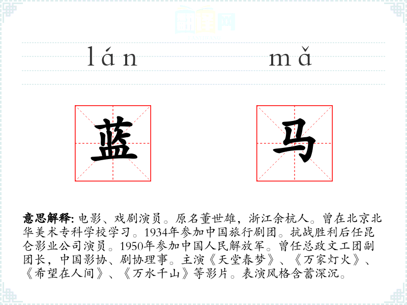 1.电影、戏剧演员。原名董世雄,浙江余杭人。曾在北京北华美术专科学校学习。1934年参加中国旅行剧团。抗战胜利后任昆仑影业公司演员。1950年参加中国人民解放军。曾任总政文工团副团长,中国影协、剧协理事。主演《天堂春梦》、《万家灯火》、《希望在人间》、《万水千山》等影片。表演风格含蓄深沉。