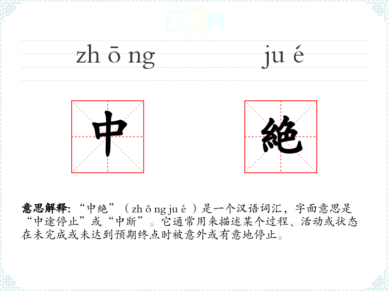 “中絶”一词由“中”和“絶”两个字组成。“中”表示中间或中途,“絶”表示断绝。在古代汉语中,“絶”已有断绝、终止的含义,而“中絶”则是这一概念的延伸,强调在过程中的中断。
