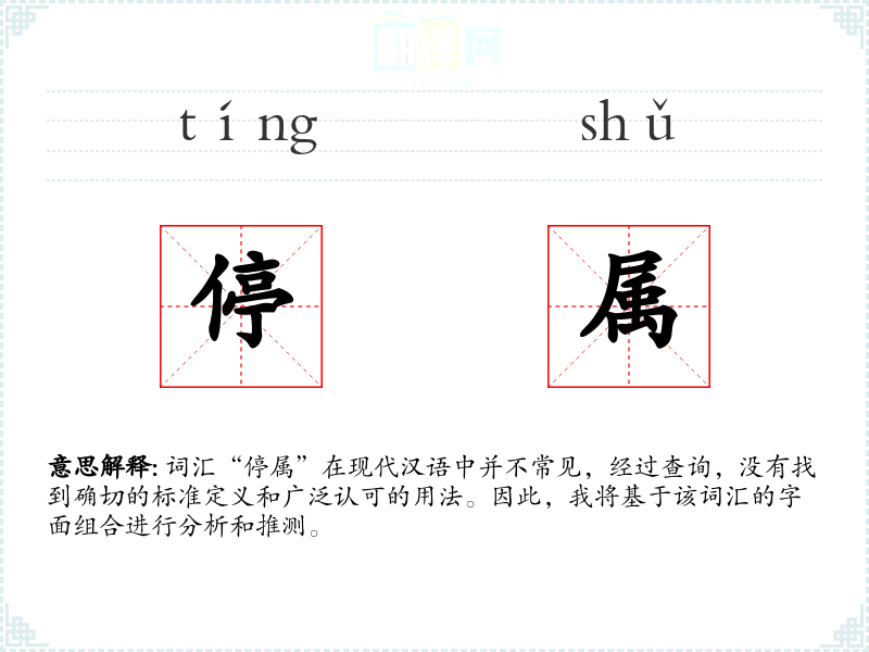 词汇“停属”在现代汉语中并不常见,经过查询,没有找到确切的标准定义和广泛认可的用法。因此,我将基于该词汇的字面组合进行分析和推测。
