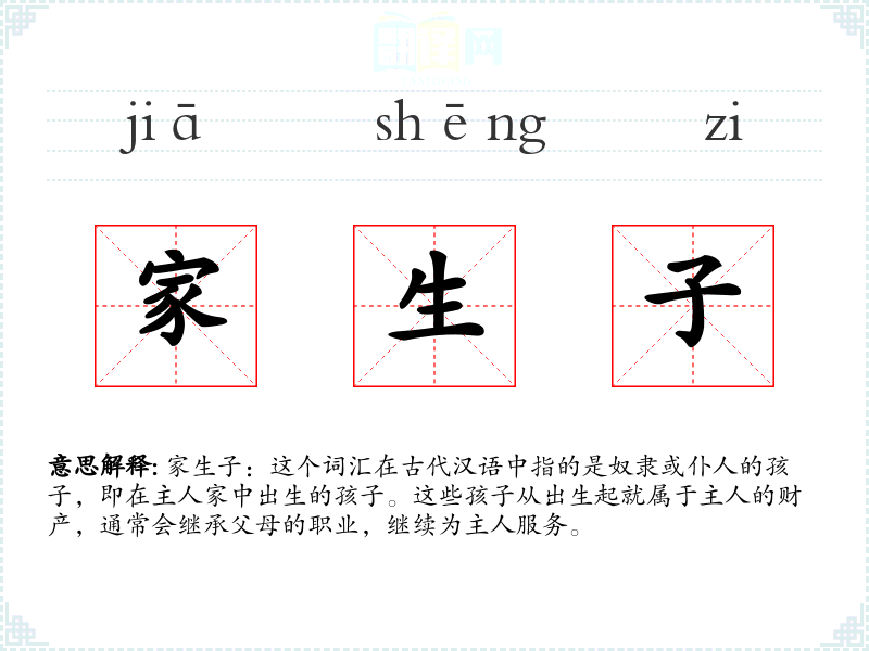 词源:“家生子”一词源于古代汉语,其中“家”指主人家,“生子”指出生的孩子。 演变:随着社会的发展和奴隶制度的废除,这个词汇逐渐从日常语言中消失,但在历史文献和学术研究中仍被使用。