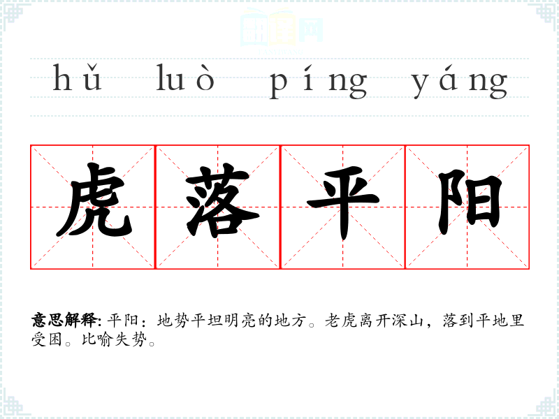 平阳:地势平坦明亮的地方。老虎离开深山,落到平地里受困。比喻失势。