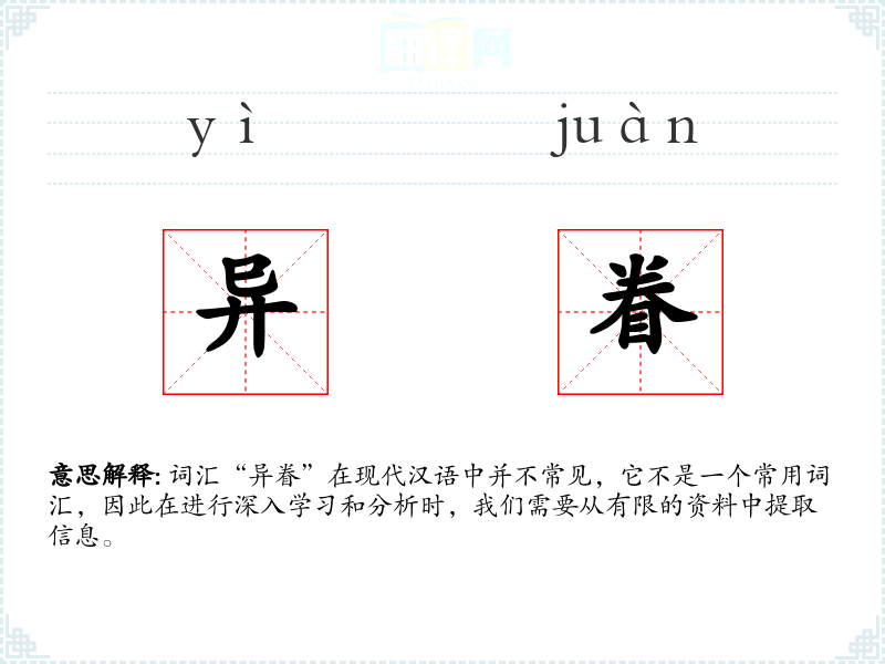 词汇“异眷”在现代汉语中并不常见,它不是一个常用词汇,因此在进行深入学*和分析时,我们需要从有限的资料中提取信息。