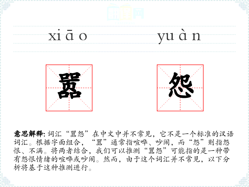 词汇“嚣怨”在中文中并不常见,它不是一个标准的汉语词汇。根据字面组合,“嚣”通常指喧哗、吵闹,而“怨”则指怨恨、不满。将两者结合,我们可以推测“嚣怨”可能指的是一种带有怨恨情绪的喧哗或吵闹。然而,由于这个词汇并不常见,以下分析将基于这种推测进行。