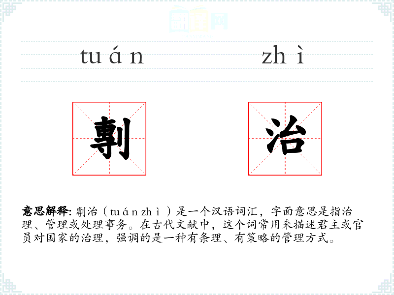 剸治(tuán zhì)是一个汉语词汇,字面意思是指治理、管理或处理事务。在古代文献中,这个词常用来描述君主或官员对国家的治理,强调的是一种有条理、有策略的管理方式。
